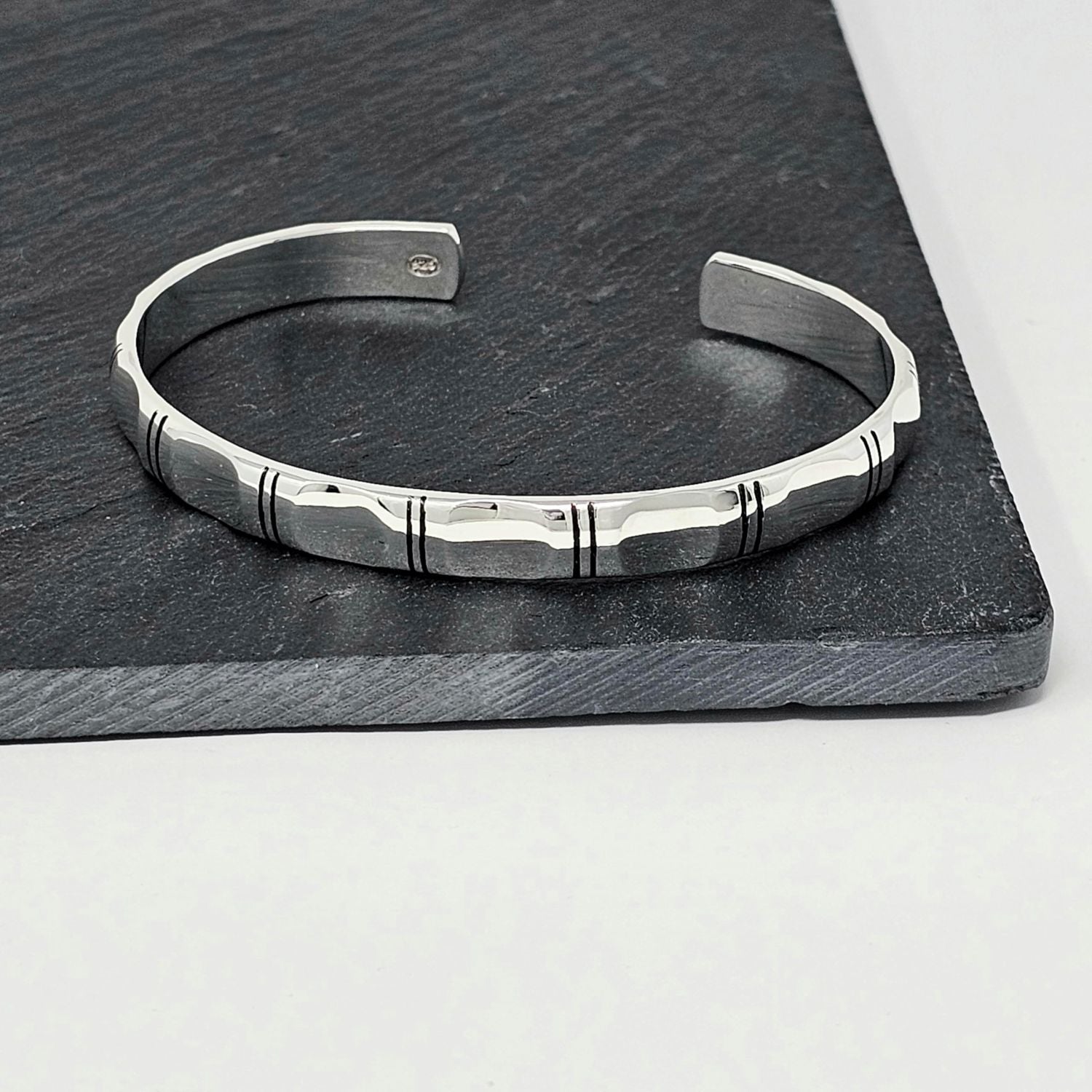This simplistic bracelet is made from quality solid 925 Sterling silver. Embellished with engraved black enamel lines for a stylish look for any ensemble and for all occasions. This bangle can be worn by both men and women.
